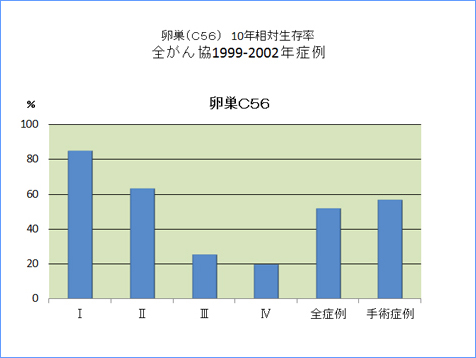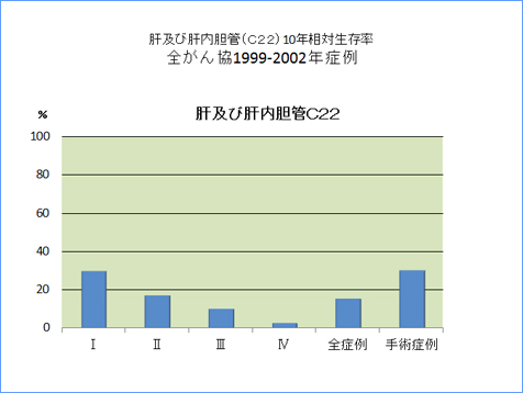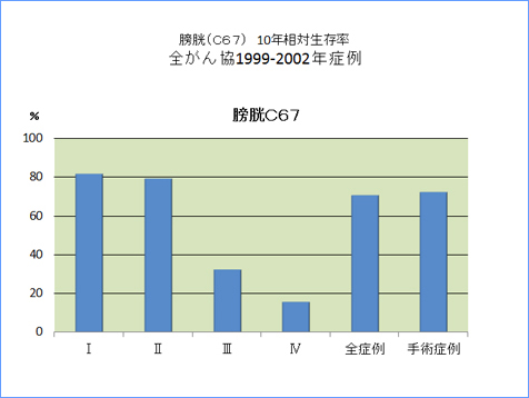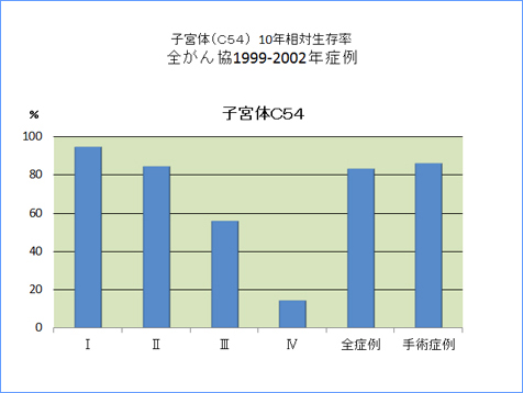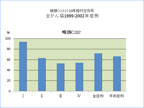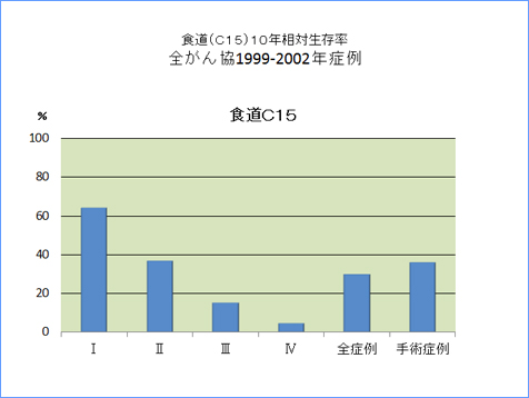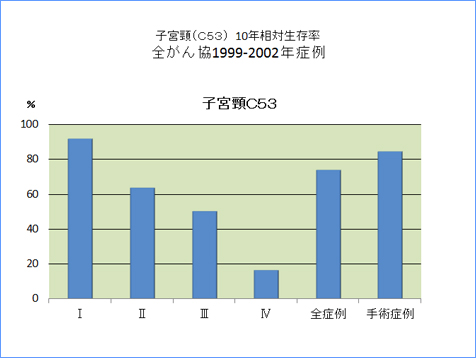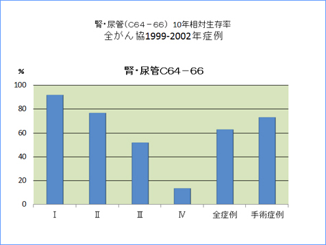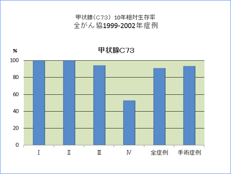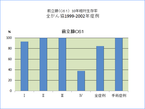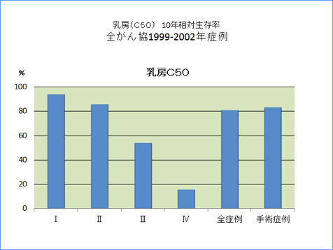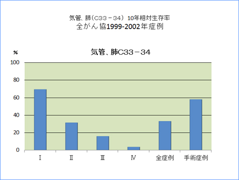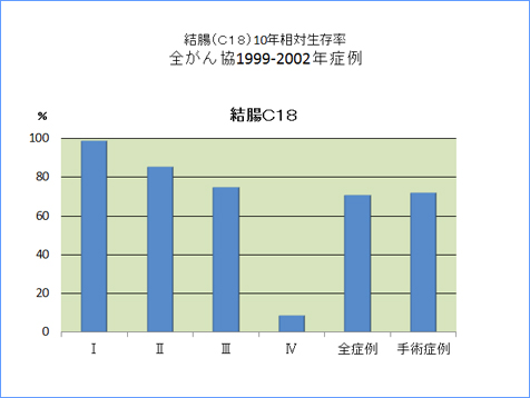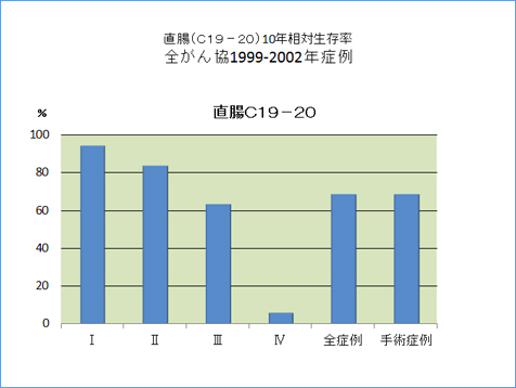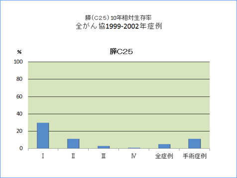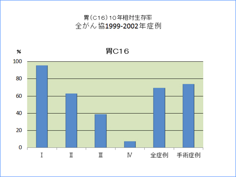 全がん協部位別臨床病期別10年相対生存率一覧(1999年〜2002年)
